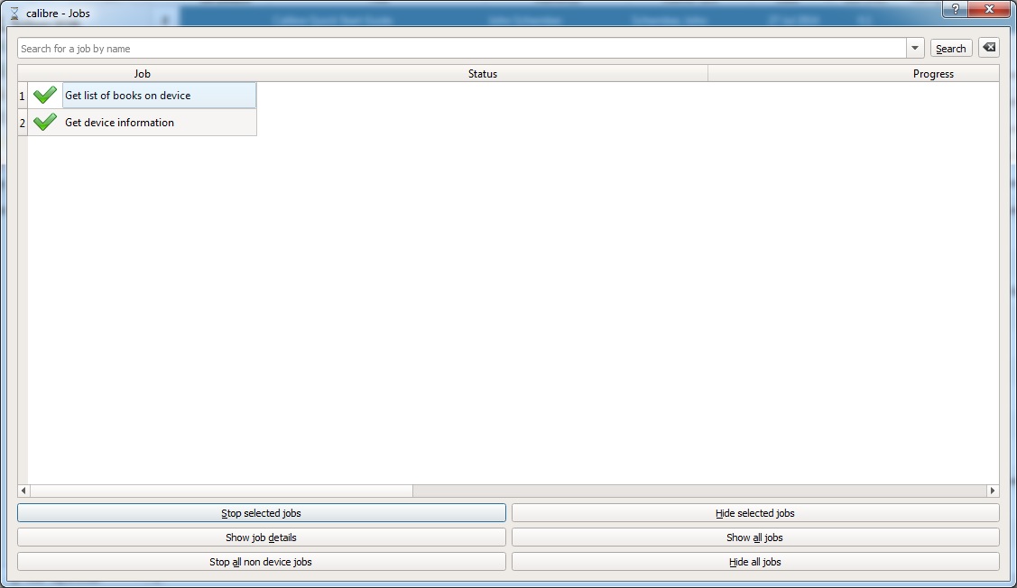 I don't know if I would call this a bug but it's a bit of an annoyance. When I connect my Aura HD to Calibre, the Get list of books on devices shows Working as the status for a few seconds, then switches to getting books on device. At the point, the progress goes from unavailable to 100% where it sits until the job is finished. I used to know that it took about 50 seconds for the job to complete but now the running time doesn't show so that is no longer helpful.