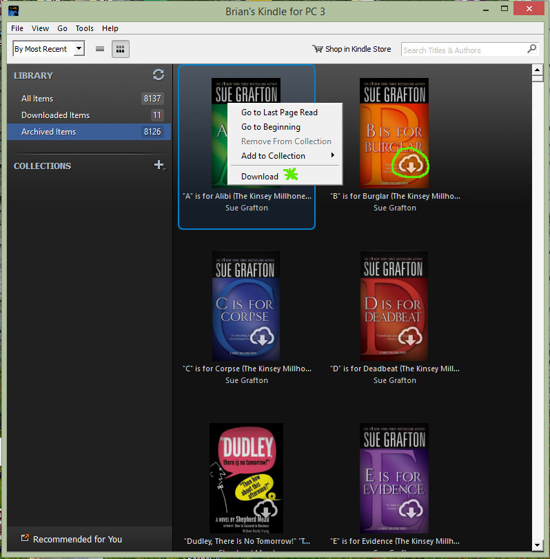 But just downloading to the K4PC from Amazon does not seem to get them into the "My Kindle Content" folder. It seems I have to open them in the Kindle app to make them go to that folder. No? I have over 800 boks, and opening each one could get dificult. Thank you for your patient help. |