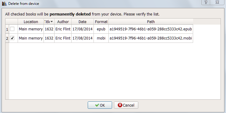 I detected the duplicates in Calibre and deleted them from Calibre but they exist on the device as detected by Calibre. Can I make Calibre delete the copies on the device? In Calibre I see a book and in the On Device column I see next to the green check mark in parentheses either (two books) or (three books) for the ones with duplicates. In Calibre, when I select the book, use the context menu, I see Remove Books options. The only option for removing from device removes all of the copies of a book, not just the duplicates. Options as I see them are: 1) Delete the entire library off of the device and reload it. 2) Go through each book on the device and manually identify duplicates and delete them. 3) Since my library is on the SD card on the device, I can place the SD card on the PC SD Card Reader and use a PC duplicate finder to find them and delete them. Do you have an opinion on which of these would be easiest to accomplish? Thank you for all of your work. Last edited by gsparks2; 08-17-2014 at 10:41 AM. |