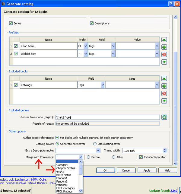 'Extra Description note' is displaying: Words / Status / read & read all 'Merge with Comments': Pairing (Relationship) // Rated // Genre // Characters Both columns are built from other columns. You can see in the picture the outcome. Mini |