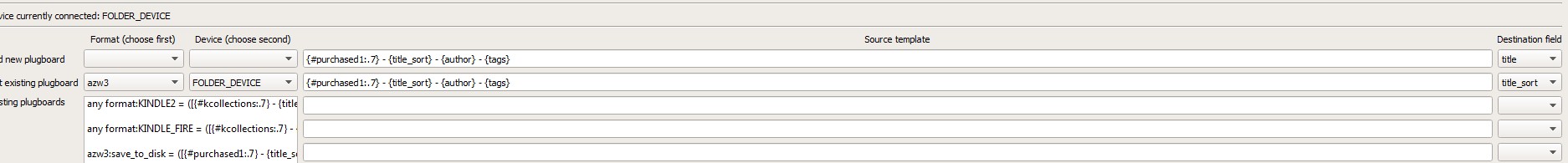 It is just coming out with the title. When I looked at the metadata with the metadata editor program for those that have a similar plugboard and are sent directly to my pw2, it has the plugboard info in the Title field. But for the Save to Disk ones they are not being adjusted. I tried changing it from azw3 to all formats and still no change for the save to disk. Then I thought it was selecting the send only azw3 to a single directory, and tried it with all the options and still no adjustments. I do not know what else to try to get the plugboard to work.