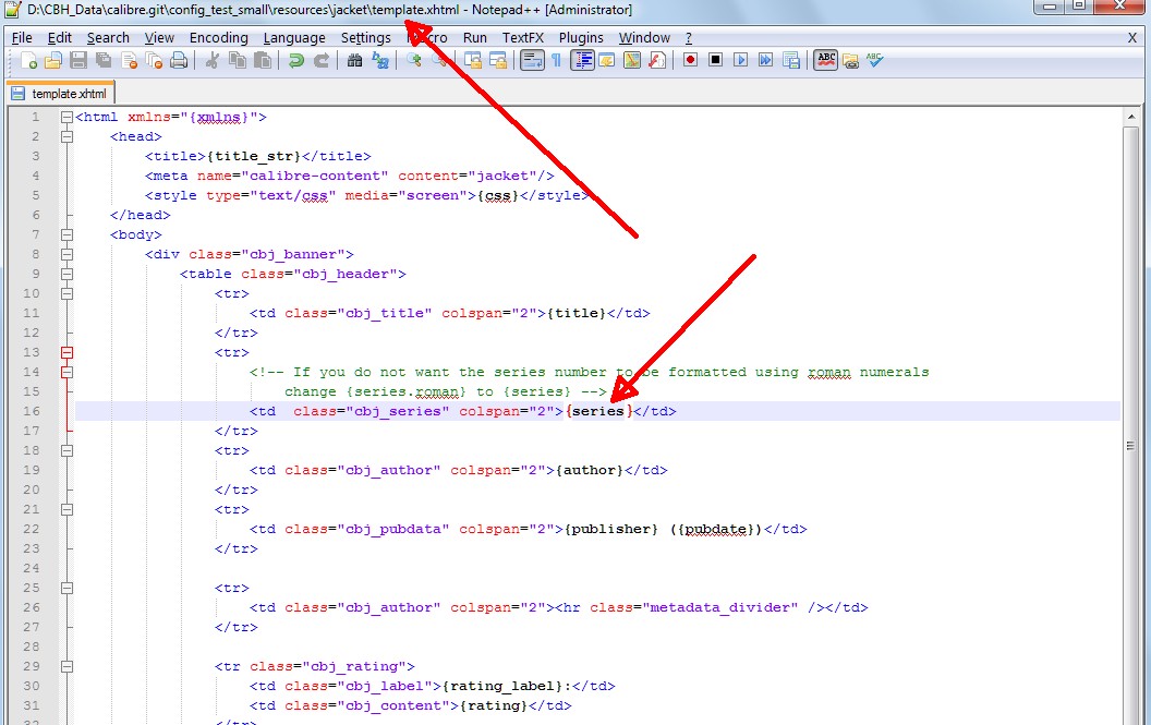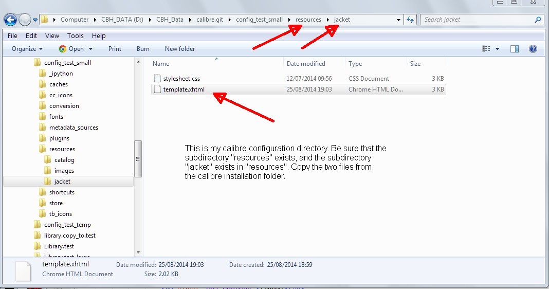 In main GUI program (library manager) go to Preferences->Miscellaneous and click Open configuration directory that will open your Calibre Config folder in Windows Explore - it'll be something like c:users\<you>\appdata\roaming\calibre - keep the window open. Close calibre. So now you will have two windows explorer windows - something like this If you don't have a resources subfolder in the configuration folder create an empty one - I'll assume that you didn't have one So open the two resources folders and you should see something like this Now you need to COPY the jacket folder from the Program Files/resources (left) to the Configuration/resources (right) so you end up with this OK we've finished with Program Files so close that window and open the jacket folder in the Config Zone - there are two files stylesheet.css template.xhtml You need to edit template.xhtml, but first you must remove read only, right click the file and select properties - uncheck Read Only and click OK You need an editor other than Notepad - a lot of us use Notepad++, viz While I was there I made the change so I've attached the template.xhtml file (it's in a zip - can't upload xhtml), try to do the change yourself - but if you get into trouble just use the one below BR How do people cope with Windows Explorer, it really is pathetic. Last edited by BetterRed; 05-15-2015 at 09:06 PM. |
