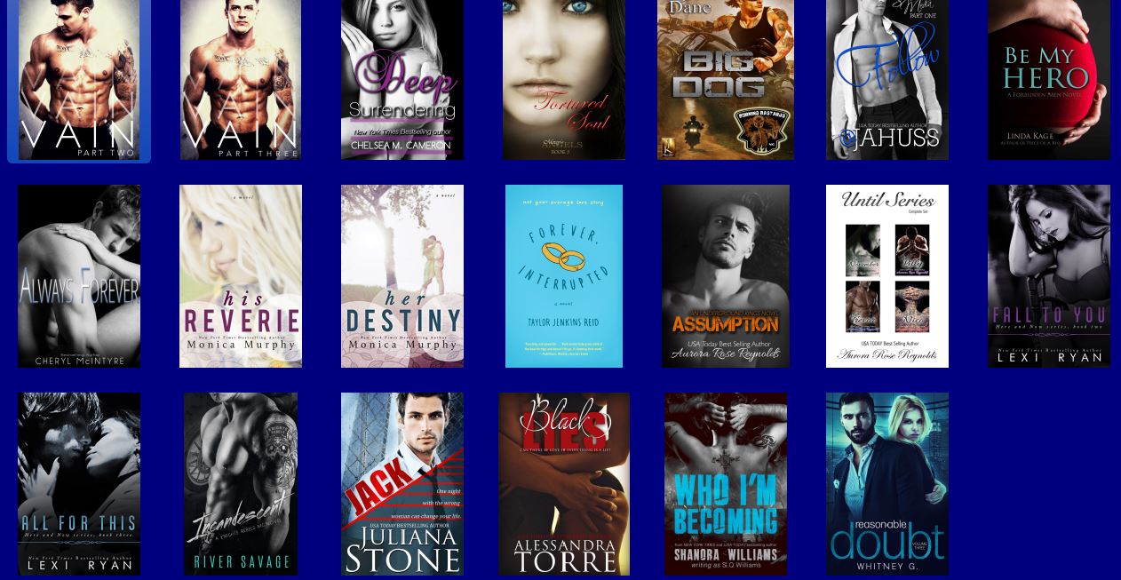 Marliss Melton.....Forget Me Not.......4 Julie Garwood......Killjoy.......3.5 Cristin Harber......Winters Heat.....3 Julie Garwood......Honor's Splendour....3.5 Bought Give Me Grace......Kate McCarthy The Viper..........Kele Moon Reasonable Doubt 1,2,3.....Whitney G Redeeming Justice.......Suzanne Halliday Into the Shadows.......Carolyn Crane Stolen Heat.......Elizabeth Naughton |
