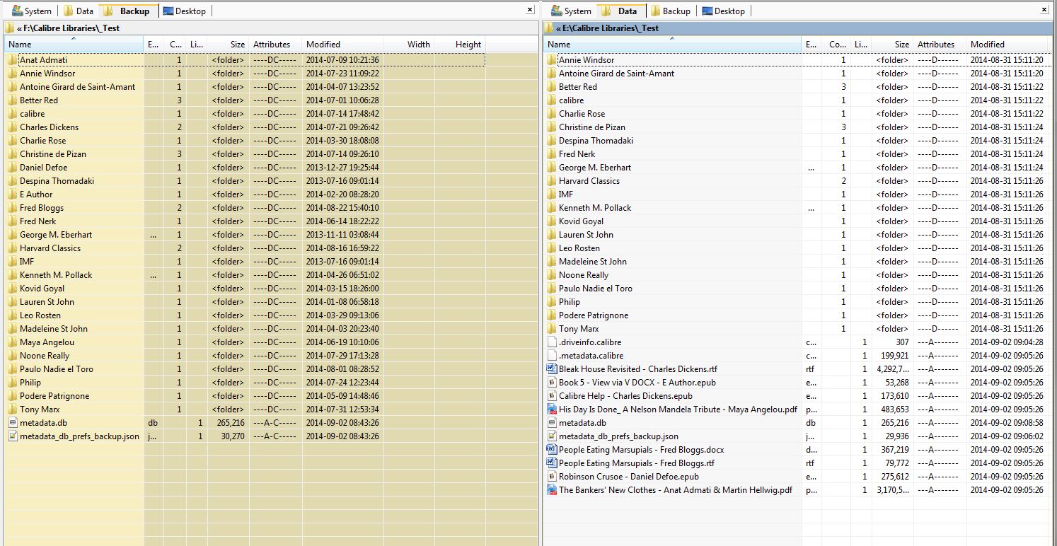 Then if you send some books to that folder you'll end up with a bit of shambles see second attachment. The backup is on the left, the operational library is on the right So I'm postulating that the OP made a genuine usage mistake rather than breaking the 'golden rule'. @madelonw - does the above make any sense, might you have inadvertently selected your library folder in a Connect/Share->connect to library. I used a Test library, the 9 books I sent to the Connected folder disappeared from the Library, as can be seen in the second attachment there are less author folders on the right than there are on the left. IMO you need to build a new library by importing books from the 'broken' one - but I'm unsure of the best way to do that such that your metadata is retained. If the library copies have current metadata embedded - eg via Polish, Modify or Embed then its easy to set up the Add options to extract metadata from the books, if not then ideally you would want to get the metadata from the opf files, I don't know how to do that. Oh, to retain your custom columns in the new library, you should be able to created the new library based on the existing one. Aside : maybe there should be a warning - "Do you really want to connect to this library folder" ie a folder with a metadata.db. BR |