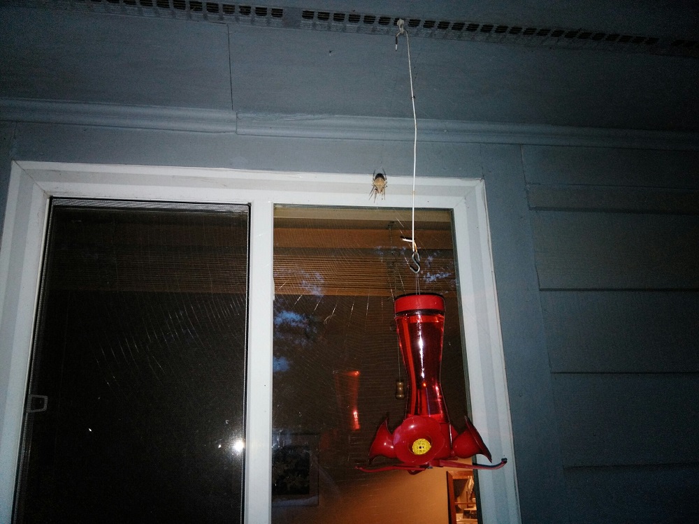 On the deck, we're 'hosting' a new spider that builds her web from the eaves down to the deck furniture - surrounding the hummingbird feeder.