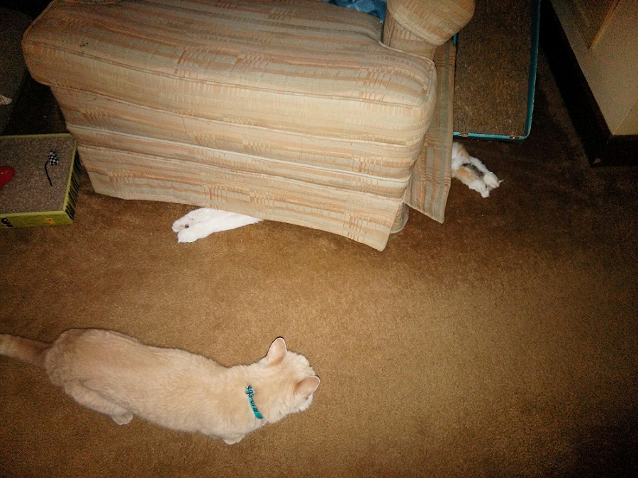 Stella loves to play 'ambush cat' - she hides under an arm chair (unfortunately she's too big to fit) and waits for Goldie to walk by ..... it's a shame she falls asleep in the dark .... and her prey escapes!