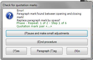I also made another option for the next version (which is in beta now). If a dialogue/quotation spans multiple paragraphs and the next paragraph starts with a opening quotation mark (English) or a closing quotation mark (Spanish), the procedure will still stop at the paragraph mark, but not at the quotation mark anymore. So, that would prevent errors and additional actions.