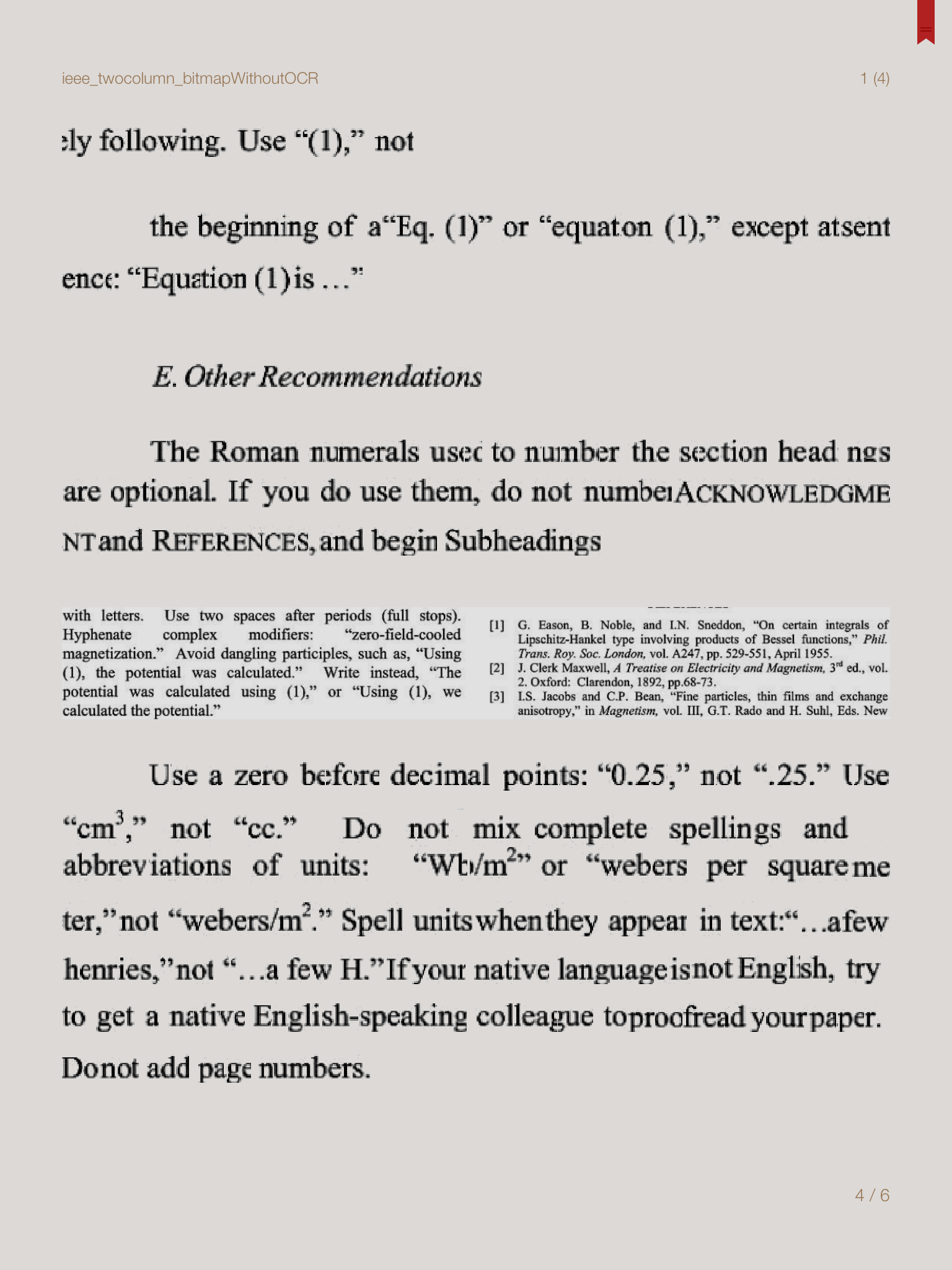 e.g. I can usually use Sony's Prs-t1 landscape mode for A5 pdfs but if I want to use pen for scribbling I have to leave this zoomed mode for normal view getting back to it after scribbling, also page flipping is not nearly as fast as with using pdf optimized with k2pdfopt's fitwidth mode or reflow mode. There is Duokan for iOS 7+ too. Textual pdfs (vectors) are being reflowed without pictures as majority of e-readers (with pdf reflow capability) do, text is searchable, highlightable... . Scanned pdfs are quickly reflowed. I have joined three of your two-column templates and this six paged pdf has been reflowed on iPad 4 instantaneously, with pictures included, but some words are joined together as can be seen in attachments. Here's captured screen of your two-column template(converted beforehand to bitmap without a OCR layer) and couple of increased values for bigger letter size. Some text has been shown as picture. Last edited by markom; 09-15-2014 at 11:48 AM. |