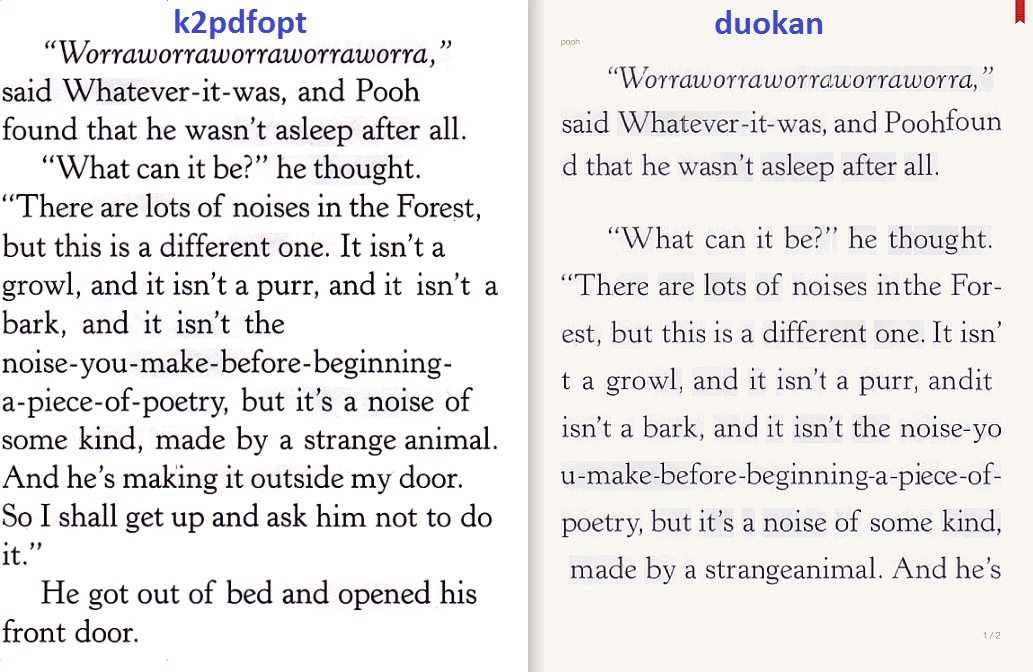 I tried duokan on an iPad 3 and it is definitely satisfactory for real time reading in terms of speed--impressively fast, but it didn't always piece the words together quite correctly in the example I tried (see attachments from my source file that I posted earlier in this thread--duokan images are screenshots from an iPad 3; k2pdfopt images are from the default settings). I did not realize that duokan had the capability to graphically re-flow text. How long has duokan had this feature?