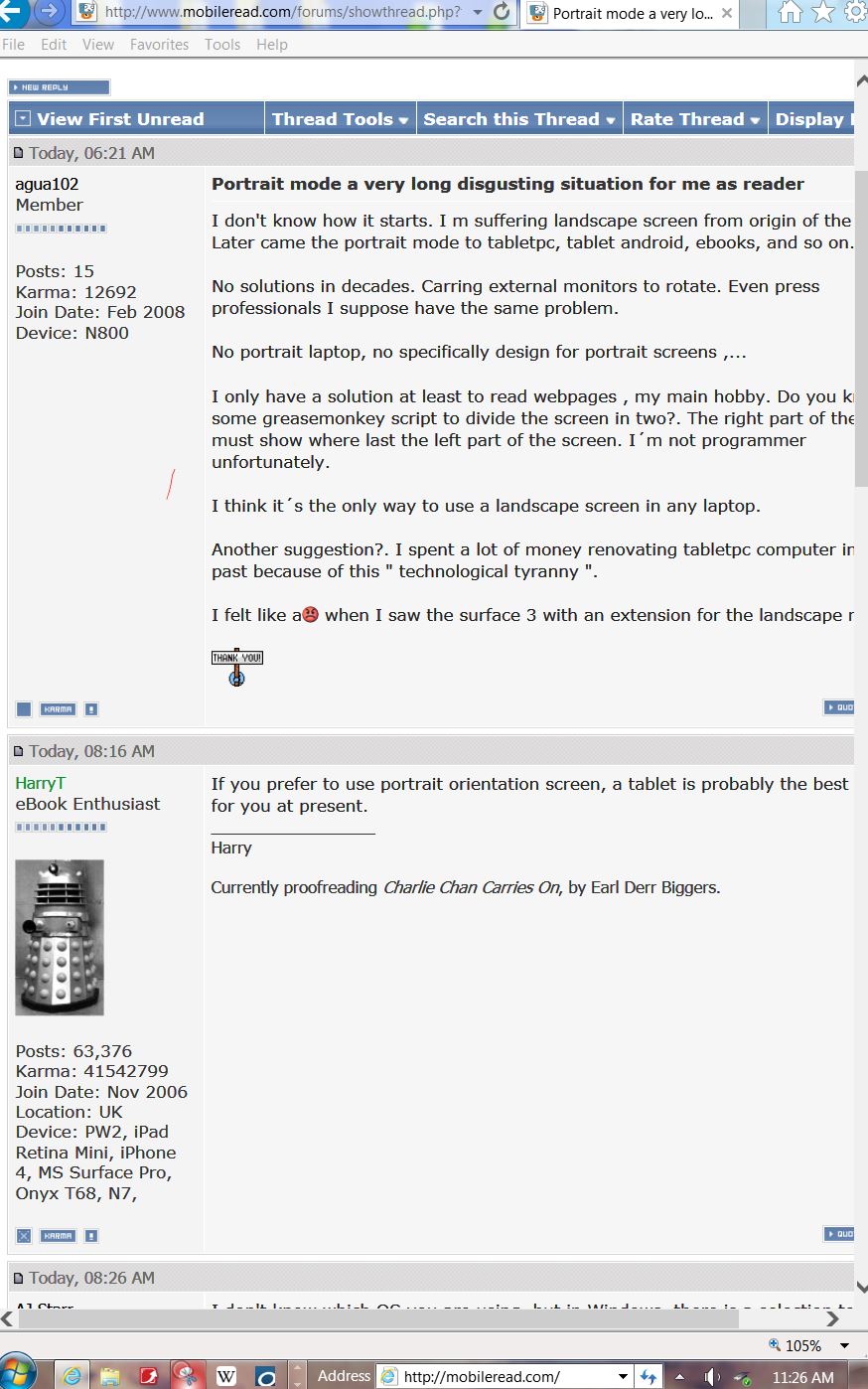 No solutions in decades. Carring external monitors to rotate. Even press professionals I suppose have the same problem. No portrait laptop, no specifically design for portrait screens ,... I only have a solution at least to read webpages , my main hobby. Do you know some greasemonkey script to divide the screen in two?. The right part of the screen must show where last the left part of the screen. I´m not programmer unfortunately. I think it´s the only way to use a landscape screen in any laptop. Another suggestion?. I spent a lot of money renovating tabletpc computer in the past because of this " technological tyranny ". I felt like a when I saw the surface 3 with an extension for the landscape mode.