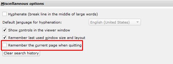 There is such an option. But what happens is that (for ePub), a file is stored inside the ePub that lets the viewer know what page the ePub was last opened to. This (IMHO) is not solution I want. I don't want my ePub modified just to keep track of the page number.