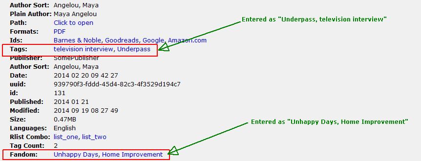 When I enter Tags they are sorted in the Book List and in Book Details When I enter Fandoms they are sorted in the Book List but they are not sorted Book Details If I use the template {tags:sublist(0,1,\,)} I get the first Tag in an alpha sorted list. If I use the template {#fandom:sublist(0,1,\,)} I get the first Fandom I entered. Is there any way I can get a list of Tags in the order I entered them? BR Last edited by BetterRed; 09-18-2014 at 07:00 PM. Reason: add jpg |