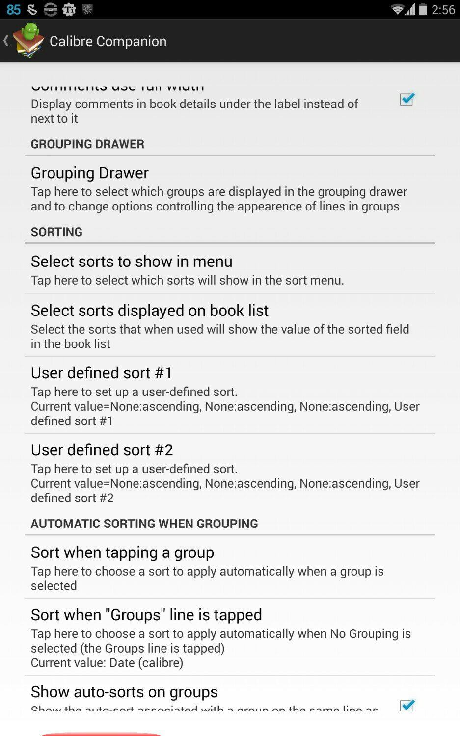 When I went into the Grouping Drawer settings, I looked at Make groups for custom columns but didn't change anything. I hit OK instead of cancel and even though I didn't change anything it still updated the database. I exited CC and went to the settings again and it didn't update when I hit OK the second time. I backed CC up right after updating to 4.4.4g so I restored it to see if maybe I did tap something without realizing it, but it did update the db even without me making changes. Has there always been empty space at the top and bottom of the settings menu? I only noticed because I was having trouble scrolling up and down in the menu. If I first touch the empty area and continue swiping the menu doesn't move. My Nexus 5 doesn't have the same blank area. Here's a screenshot from my Nexus 7 with cutoff text at the top and bottom so you can see the empty spaces: |
