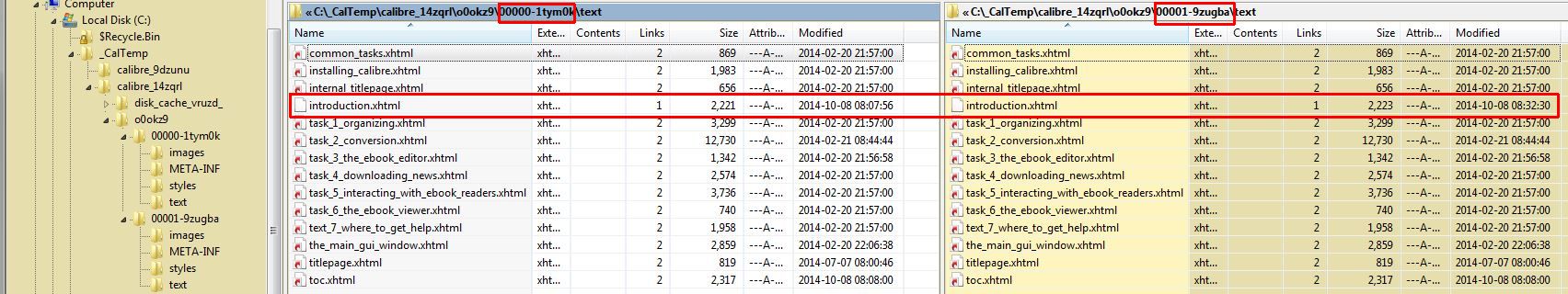 What I see when I open a book in the editor is that calibre creates a folder in %CALIBRE_TEMP_DIR% with two subfolders (0000_xxxx and 0001.xxxx) each containing a hardlink clone of the book content files, if I change a file, the original remains in 0000.xxxx and the new will be in 0001_xxxx, obviously they're no longer hardlinked to the same data. I've not tried putting the temporary location on a file system that doesn't support hardlinks, such as FAT32 or ReFS ![]() BR Last edited by BetterRed; 10-07-2014 at 07:14 PM. Reason: change image |
