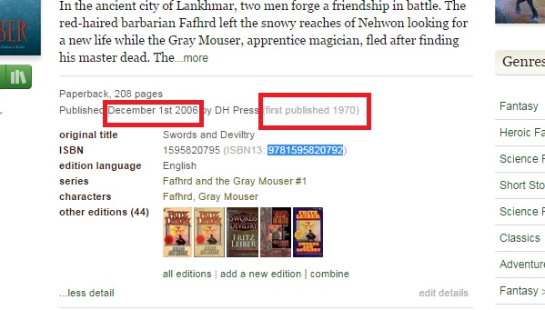 Is there any way to scrape the "first published" date from goodreads? E.g. "Swords and Deviltry" https://www.goodreads.com/book/show/...s_and_Deviltry The book was published in 2006 however the first time it was published was 1970 (attached screenshot). So far I have been unable to ever get calibre to store the 1970 date and I always get 2006 I have tried selecting and unselecting "Use published date of "first edition" (from worldcat.org)" - it makes no difference. Thank you |
