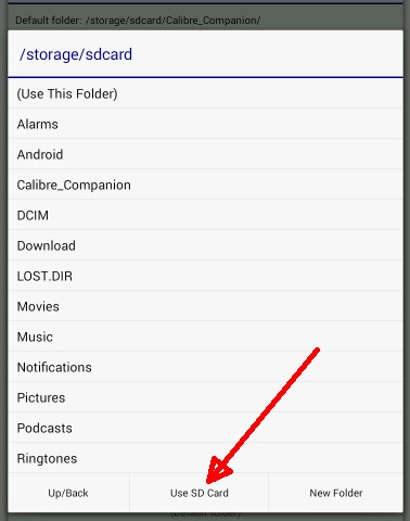 Thanks for reply. Here's what baffles me. My new phablet (phone + tablet) has GPS built in. I download Mapfactor: GPS Navigator from Google Play to work with it. I choose to download US maps, about 1.6 GB data. Immediately pops up two item menu showing the path and size for the internal SD card and my external SD card. It instructs me to choose which one the maps should be saved to. I click on my external SD card. The program takes off saving the maps there. When finished, I check my external SD card and it has about 2 GB less space free. My question is why can this program deal with the external SD card no problem but Calibre Companion cannot?