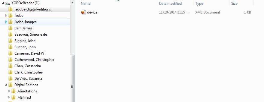 ![]() Yesterday I signed out of one account on the glo and then used a newly downloaded version of Kobo Desktop for PC to install the Glo firmware. I then side loaded the epubs from Calibre. When I noticed the files I deleted .adobe-digital-editions directory, and the Digital Editions directory containing the files Annotations and Manifest, with no harm done because I was able to continue reading the book that was in the Manifest. The Manifest file appeared to copy the book from the book list into it. But the next time that I plugged the Glo into the PC I noticed that these directories/files are back, and the book is back in the Manifest. Is that normal? Below are the pics. Last edited by Lynx-lynx; 10-12-2014 at 12:44 AM. |