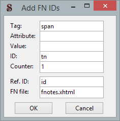 <p class="fn"><a href="../Text/Section0001.xhtml#tn1" id="id1"><span class="fnote">1</span></a> Fußnotendefinition</p> <p class="fn"><a href="../Text/Section0001.xhtml#tn2" id="id2"><span class="fnote">2</span></a> Fußnotendefinition</p> Hinweis: Alle anderen Fußnotenformate, insbesondere bereits definierte Hyperlinks werden natürlich nicht erkannt und müssen vor dem Ausführen des Plugins durch reguläre Ausdrücke in eines der beiden unterstützten Formate umgewandelt werden. Last edited by Doitsu; 01-09-2015 at 12:39 PM. Reason: Neue Version von AddIDsFN (footnote) mit BS4 hochgeladen |