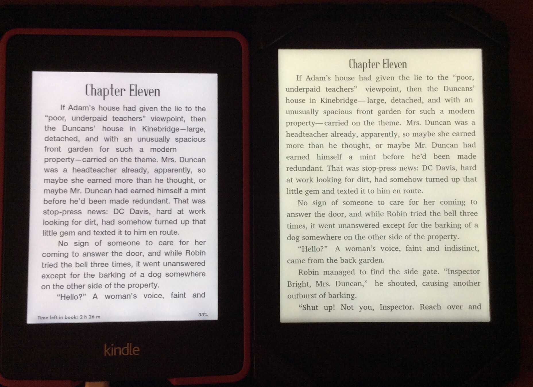 Sorry about the font. The H20 was on Charis Modified Larger, my normal font. It's now daylight here 9am though it's a miserable overcast day, both devices are on caecilia and max brightness. The stock caecilia on the H20 I've had to thicken by in the font advanced settings of the H20 as I do think the blacks are blacker on the PW2, that's the screen colour I think. I guess because I've no overhead lights on and it's a dull day the H20 screen does look cream/ivory and not white like the PW2
