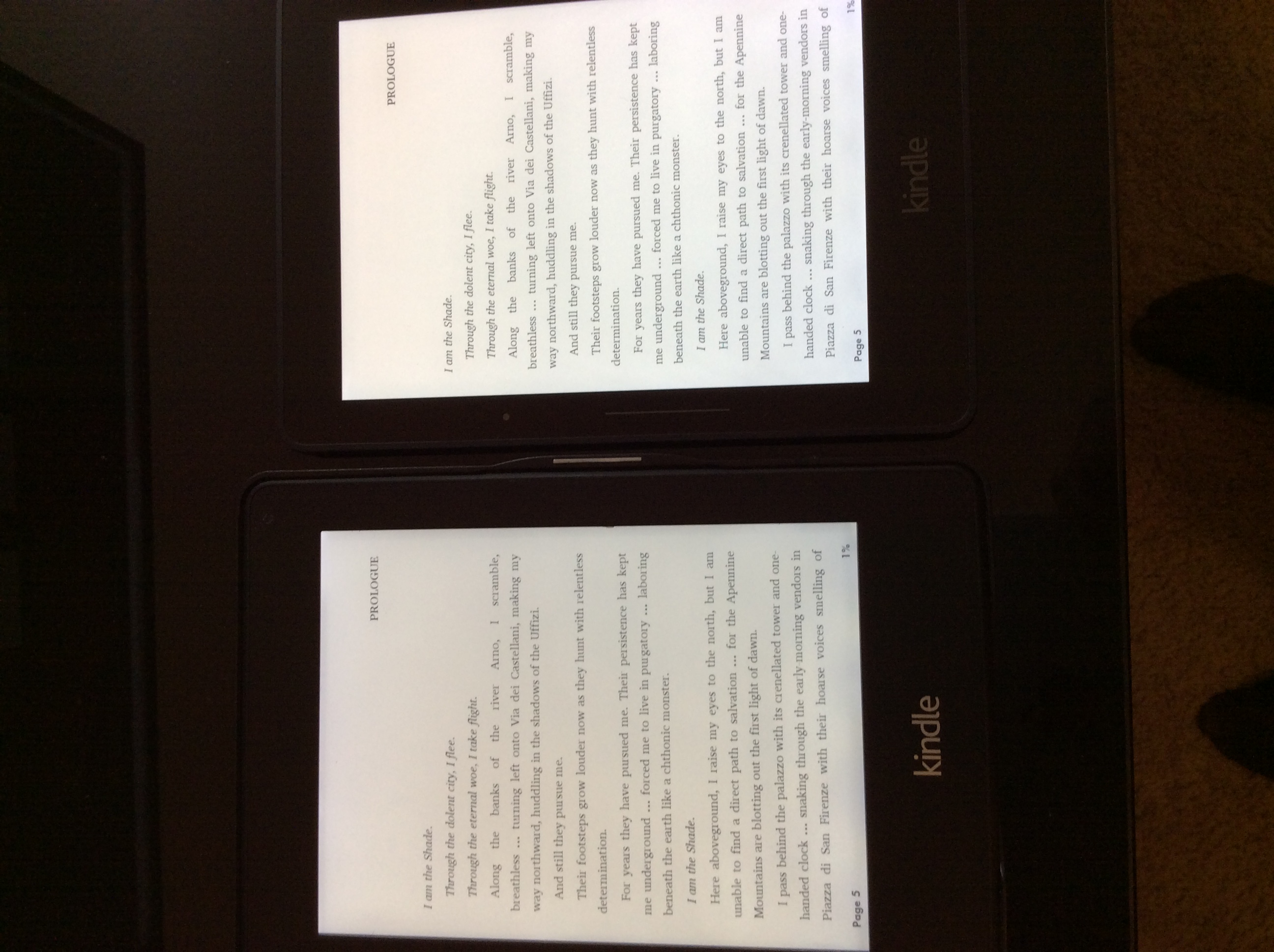 Here's a picture of PW2 (left) and Voyage. Font size is 2nd from the left (publisher font). Very readable for me at that setting. Much less page turning now. On the PW2 I had to use 4th from the left. Last edited by SCION; 10-22-2014 at 09:40 PM. |