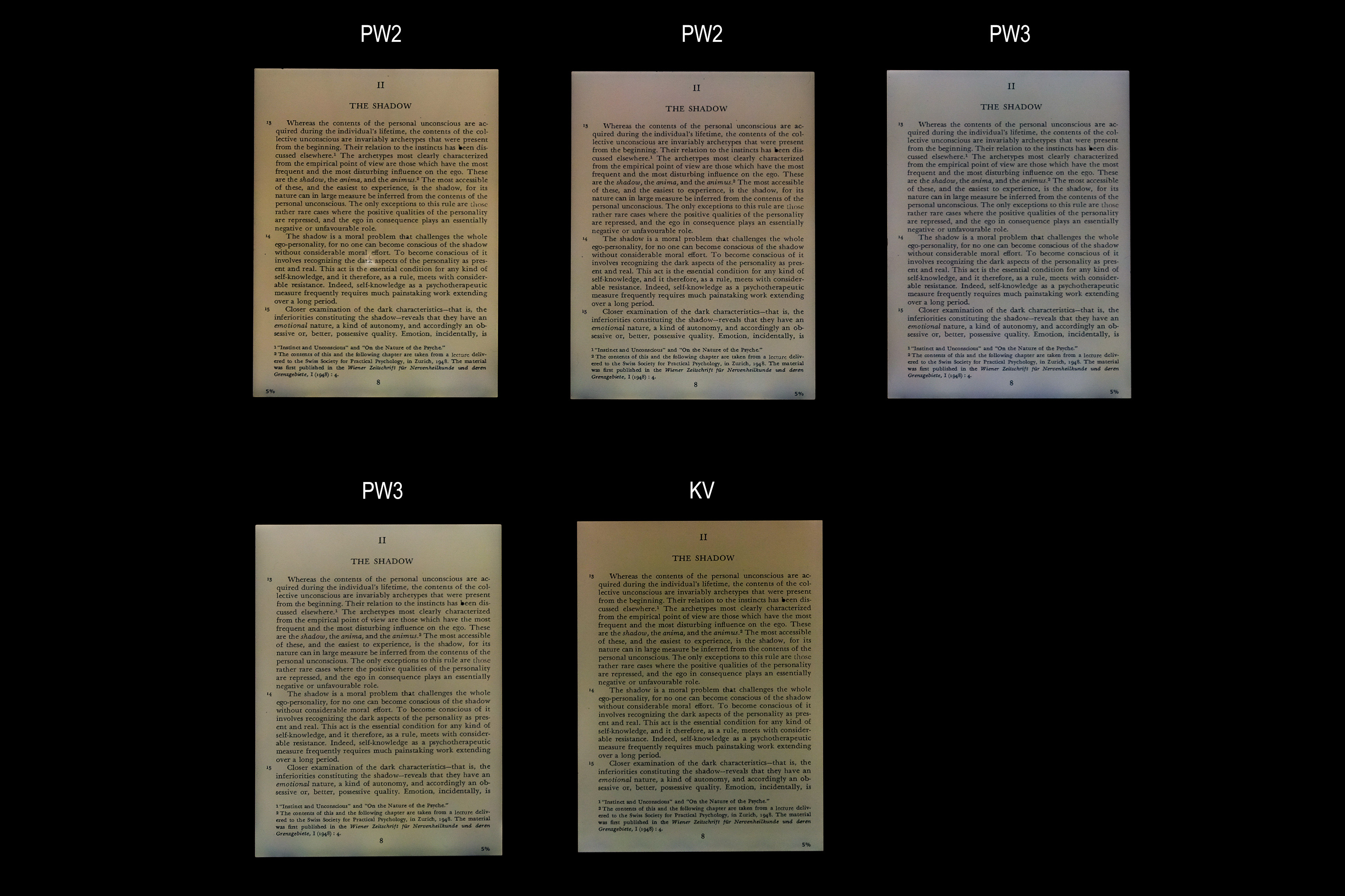 I compared 2x PW2, 2x PW3 and 1x Voyage. All the Kindles were set to brightness level 10 (max. is 24). The second photo was oversaturated +100% using Adobe Lightroom in order to better see the differences.