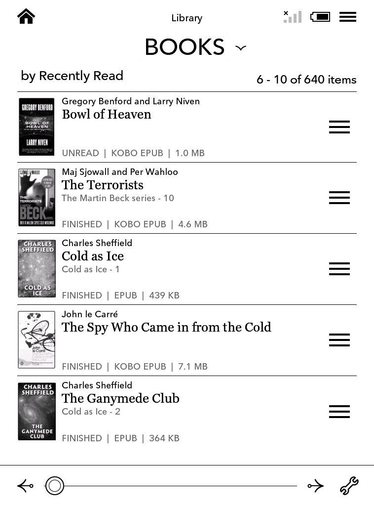 Here are a couple of screen shots from my Glo. It is not quite the same as the old homescreen I remember from before 2.6.1, but I like it an awful lot better than the new tiled homescreen. (I can't show the sleep screen because the sleep switch is used to take the screenshot). Edit: Unfortunately with this setting you also lose some of the features that were added in recent firmware, such as the back button inside the book, so it looks like I will have to put up with the tiled homescreen for a while longer. Last edited by GeoffR; 02-25-2014 at 10:45 AM. |