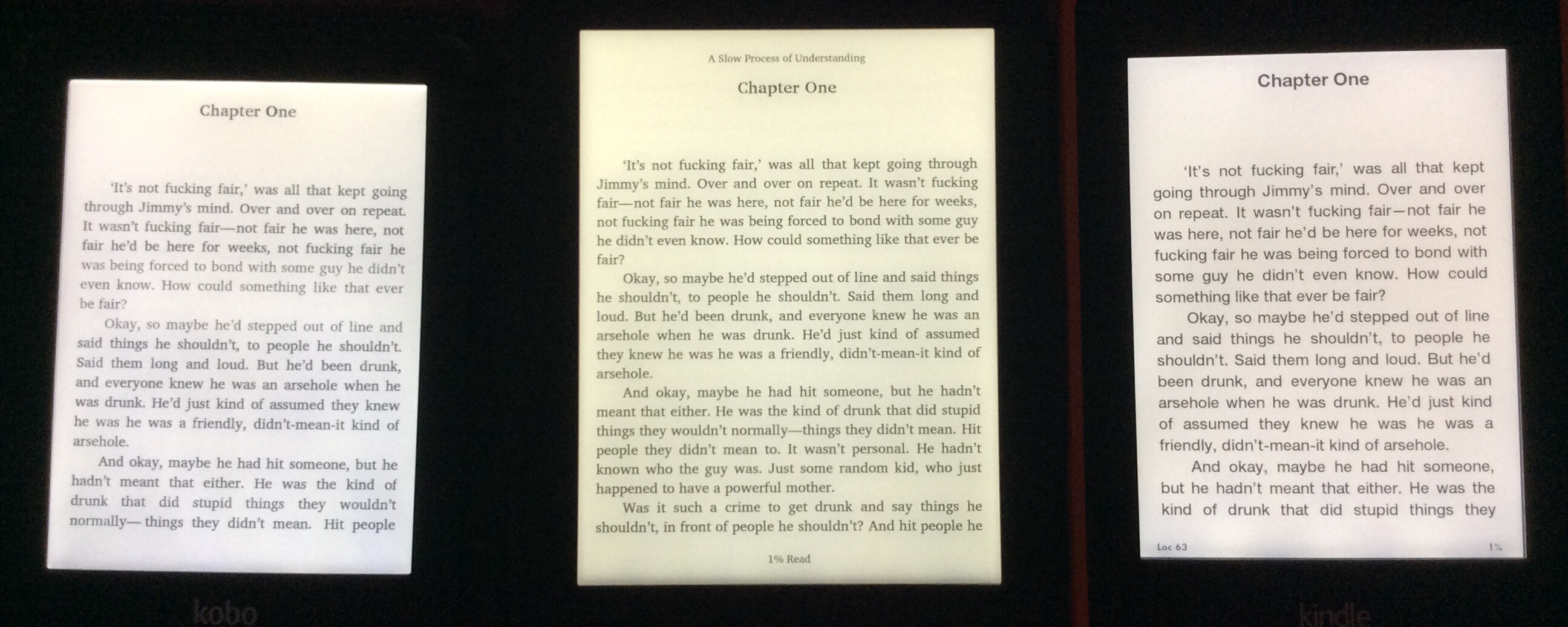 My 'perfect' (well to me anyway) screens. The light isn't good here, it's daylight but quite dark, all on the same page at max brightness. Picture taken with my iPad so not brilliant. Glo, H20, PW2. Last edited by Josieb1; 11-07-2014 at 05:04 AM. |