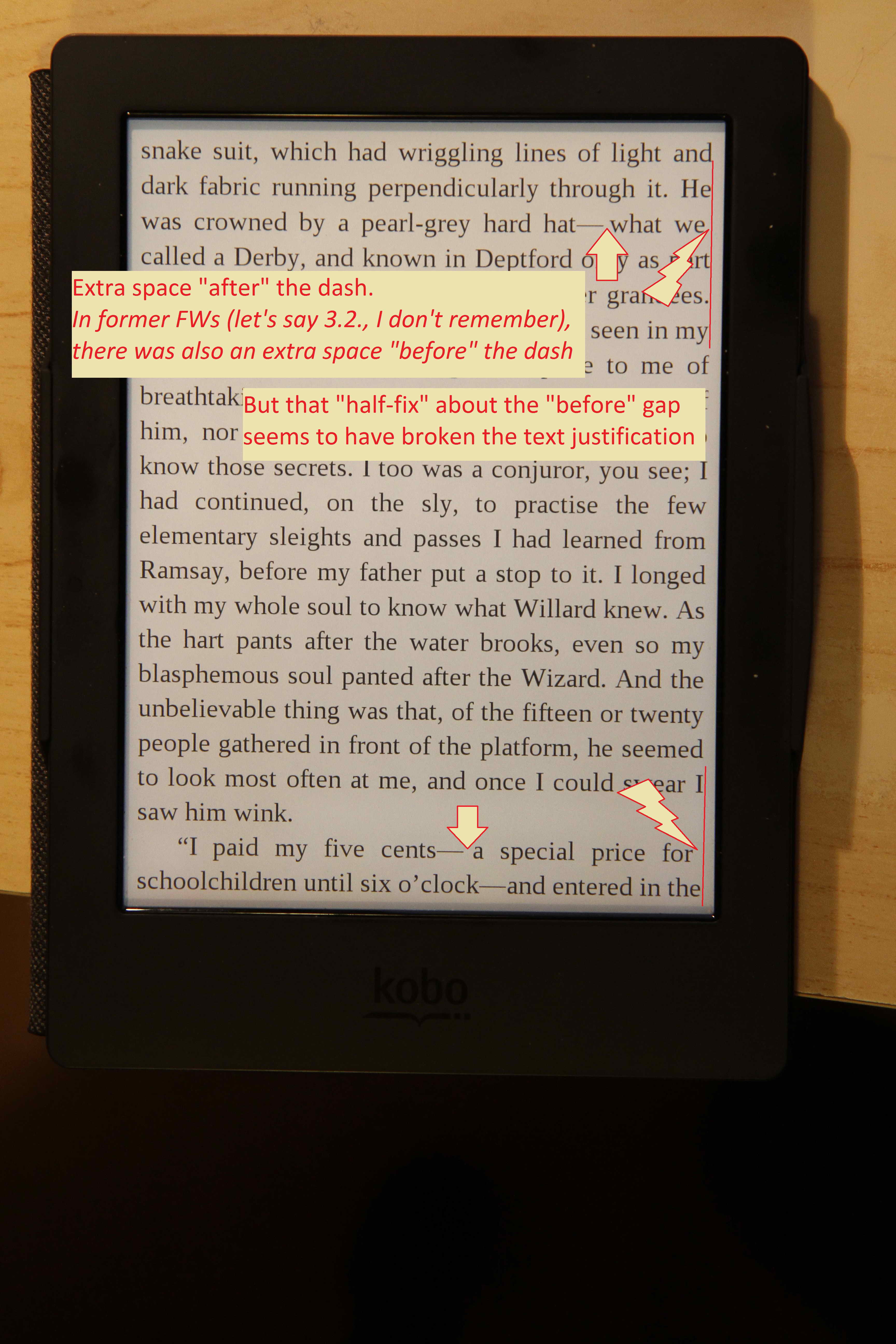 This text— with a comment— will suffer it. And it is, but the new problem is that Kobo has broken the justification along the way. Look at the attached screenshot. When that situation happens the text is not correctly justified. I really seems as if the line length is calculated with the old behaviour ("before" and "after" gaps) but as the "before" gap doesn't happen any more, your line is shorter than it should. |