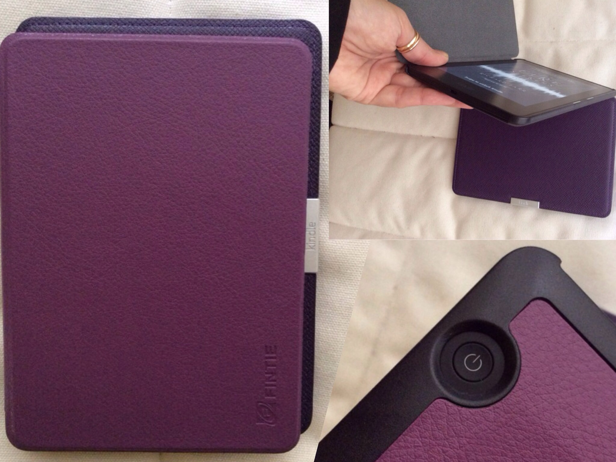 See attached for the Fintie cover. It has very strong magnets at the closure and has the auto on/off feature. Button is easily accessible, material is so-so: feels a bit too plasticky for my liking.