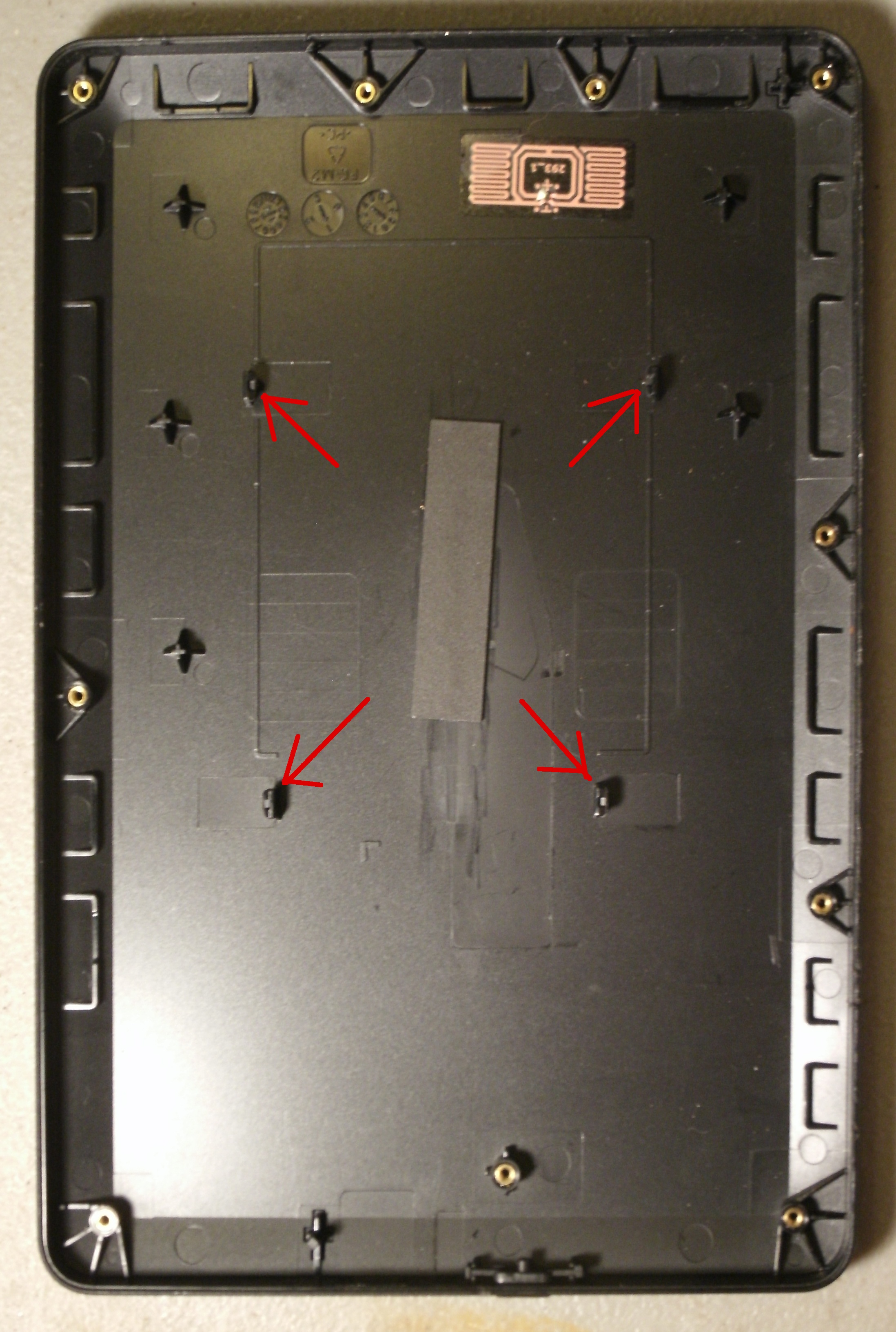 It seems that Amazon ran out of double sided tape after they stopped K4 production. But their glue pot is still full. The highlighted sections are in the same order as the pictures attached. peel-1 Starting at an upper corner - Using a thin, plastic tool (or credit card) - Work down one side, work across the top, work down the other side. Leave a trail of <something> (shown, glossy faced cardboard) behind so that the bezel glue doesn't grab the body again. peel-2 Leaving the bottom for the last peel&pry effort, (gently) rip that little sucker off the face of the body. unscrew The Kindle hardware assembly is held in the bottom (or back) case pan by 10, T-5 (torx) socket head screws. The red dots are just below the ones you want to remove. In the following, I did the "right thing" for the wrong reason. Work on these devices long enough and a person has to get lucky sometime. pry-it Using your thin, stiff, plastic tool (or strips of credit card) - - Work up the two upper corners enough so that you can "bridge" the corner radii with the cards. This leaves the e-ink display frame sitting on top of the plastic wedges, which are resting on the top edge of the case pan. Thou shall be gentle from this point on - since bending the e-ink frame is detrimental to the display's operation. It probably will not do the touch screen any good either. ![]() clips I thought I was separating double sided tape, but not so, Amazon is using interlocking, hook style, clips. clip-pts The matching hook style clips on the underside of the e-ink frame. Note that you can't just slide something in there to use as a "release tool". The least of the problems is that the battery is in the way. The worst of the problems is that the display cable is in the way. Rip that up and you have KT2 spare parts. Set aside all thoughts of brute force and reach for the hair dryer. Place Kindle face down on soft cloth, heat outside of the case bottom until it is uncomfortably hot to the touch. Work down either side with more plastic shims - The hot case back will allow the plastic hooks to flex enough to release their hold on the e-ink frame. BIG NOTE: You may have to alternate heating the backside of the case and the working of the shims down the side several times. Expect a few loud, sharp, cracks and pops. Those should be the clips releasing, not your e-ink display / touch screen being destroyed. ![]() bottom-right Here you will find two, unpopulated, pad sites. The serial port connector pad (Kindle functions in red added) and a place for the hardware reset button. bottom-left Here you will find two more, unpopulated, pad sites. One for the power on/off toggle button and one for the switch to enable booting from the USB device. And in the left-most corner of the board, the Wifi antenna. Note that is the right-most corner of the Kindle when looking at the display. usb-adpt This is the 1v8-serial to micro-USB connector, adapter board. Viewed from the underside. Note the "Control Bit" outputs (CB0 ... CB3) - those can be controlled via the USB serial cable and look like just the thing to replace the (non-existent) buttons with. (Well, the USB boot switch connections might be a bit tricky, but the rest should be straight forward.) My next goal is to find a place (hopefully inside) to install this board. - - - - - For another take(down) on the 7th gen. rip-it-apart story, see: https://www.ifixit.com/Teardown/Kind...Teardown/29802 Last edited by knc1; 11-09-2014 at 12:54 AM. |