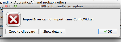 calibre, version 2.5.0 ERROR: Unhandled exception: <b>ImportError</b>:cannot import name ConfigWidget calibre 2.5 isfrozen: True is64bit: True Darwin-13.4.0-x86_64-i386-64bit Darwin ('64bit', '') ('Darwin', '13.4.0', 'Darwin Kernel Version 13.4.0: Sun Aug 17 19:50:11 PDT 2014; root:xnu-2422.115.4~1/RELEASE_X86_64') Python 2.7.8 OSX: ('10.9.5', ('', '', ''), 'x86_64') Successfully initialized third party plugins: DeDRM && Kindle and Mobipocket DeDRM && Ignoble Epub DeDRM && Inept Epub DeDRM && eReader PDB 2 PML && Inept PDF DeDRM && KindleUnpack - The Plugin && Find Duplicates && Goodreads Traceback (most recent call last): File "site-packages/calibre/gui2/preferences/plugins.py", line 292, in customize_plugin File "site-packages/calibre/gui2/preferences/plugins.py", line 370, in modify_plugin File "site-packages/calibre/customize/__init__.py", line 152, in do_user_config File "calibre_plugins.ignobleepub.__init__", line 185, in config_widget ImportError: cannot import name ConfigWidget also this comes up, see screen shot. Please help I am a little rusty with this. |
