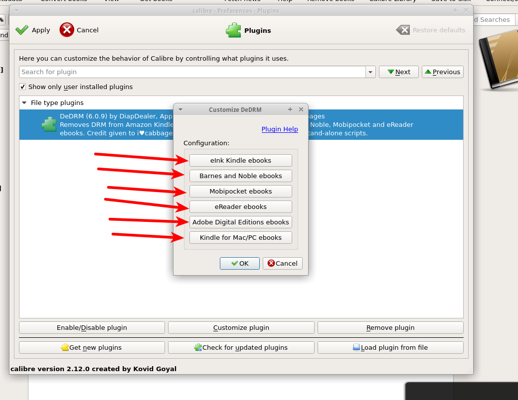 I'd lost all my books in Calibre overnight (I'd deleted some meta data files that wiped out my whole library.) so I decided to start fresh. (I only had 10 or 12 books in the library and still had the files so it was no big deal.) I made a good start following Alf's instructions but bogged down at the point of customizing the plug-in for Linux. (see screenshot 94). Seems (I found this Googling around) I need to input info (see #95) I don't have, as I don't have an ereader yet. (And therefore no serial # for Kindle or credit card info for B&N.) Would I be right in this being the reason I'm stuck? And what about #96? Am I going to be setting up all of those? And it was a little confusing too. Most of the books I'm importing into Calibre are from Kindle for PC. Would that be the first category "eInk Kindle ebooks" or the last one "Kindle for Mac/PC ebooks"? Thanks. |