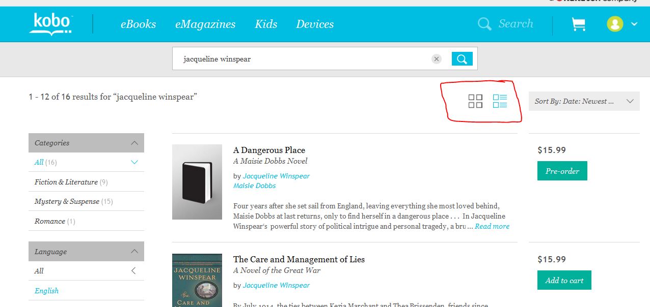 ![]() Kobo's got a new look front end and what an improvement, lol!! ![]() There's a pic below, but the main thing to notice is that once you select an author from the home page you get a new look display of books. And you get a choice of appearance. Photo one and two show the differences. So it's like they've incorporated some of the appearance of the old look site into the new look site. As far as I've noticed so far, there's no difference to the check out screen. |
