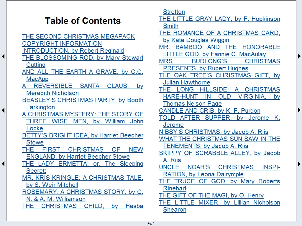 Christmas—the very word conjures up memories of the most wondrous childhood holiday of all--filled with the glitter of colorfully-wrapped presents, family visits, carols, photographs, decorating the tree, attendance at church to celebrate the birth of the Christ child, and tummy-stuffing dinners tucked with treats seen at no other time of the year. But the yule holiday has been celebrated for at least two centuries in North America, and our writers have been producing memorable stories about this unique day for almost as long. Here are 29 Christmas stories old and new, tales to delight, to entrance, to beguile, and even to sadden a whole new generation of readers. From C. C. MacApp's view of a Christmas future to Jacob A. Riis's gut-wrenching portraits of the holiday in the 1890s slums of New York to William J. Locke's reenactment of the tale of the Three Wise Men, we experience every possible facet of this most precious day of the year. So sit back and relive your memories once again, as recreated through the eyes of some of the finest writers of their time! Free today only at: http://www.wildsidepress.com/freebie.htm |