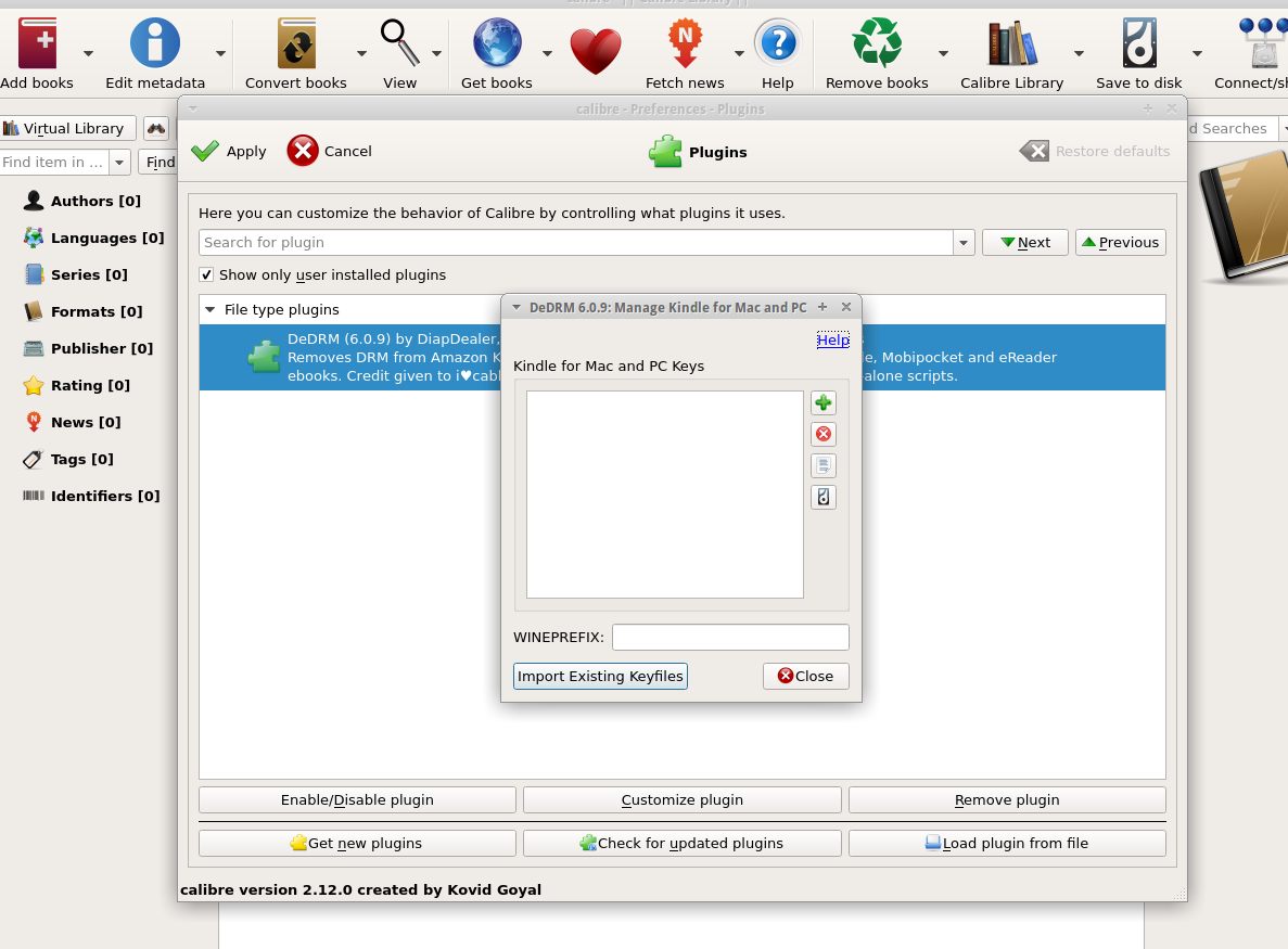 I'd lost all my books in Calibre overnight (I'd deleted some meta data files that wiped out my whole library.) so I decided to start fresh. (I only had 10 or 12 books in the library and still had the files so it was no big deal.) I made a good start following Alf's instructions but bogged down at the point of customizing the plug-in for Linux. (see screenshot 94). Seems (I found this Googling around) I need to input info (see #95) I don't have, as I don't have an ereader yet. (And therefore no serial # for Kindle or credit card info for B&N.) Would I be right in this being the reason I'm stuck? And what about #96? Am I going to be setting up all of those? And it was a little confusing too. Most of the books I'm importing into Calibre are from Kindle for PC. Would that be the first category "eInk Kindle ebooks" or the last one "Kindle for Mac/PC ebooks"? Thanks. |