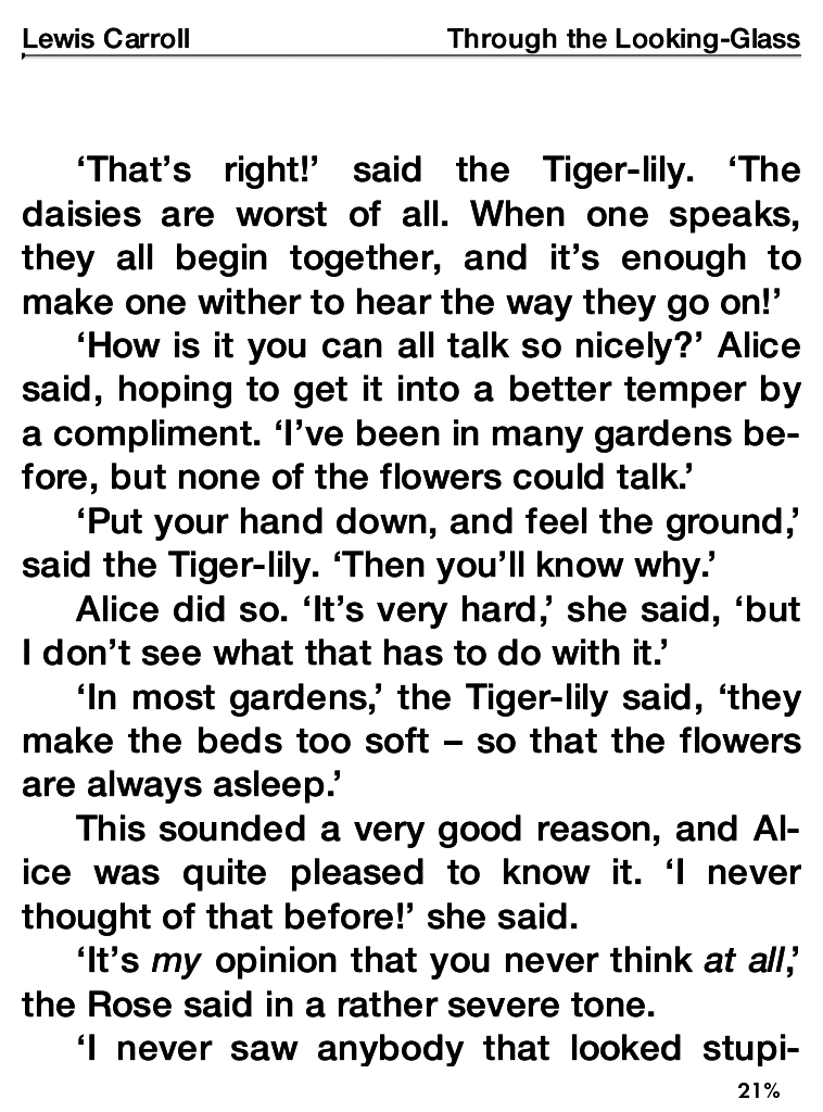 src/calibre/ebooks/pdf/render/from_html.py Thank you for implementation this ingenious technique of adding personal hacks Just one suggestion while we are on the same page: It'd be nice to have title truncated to fit into the page width. Longer title like Through the Looking-Glass, and What Alice Found There entirely carry over to the next line so that even existing 36 pt limit might be not able to accommodate it. Last edited by EbokJunkie; 01-06-2015 at 08:20 PM. |
