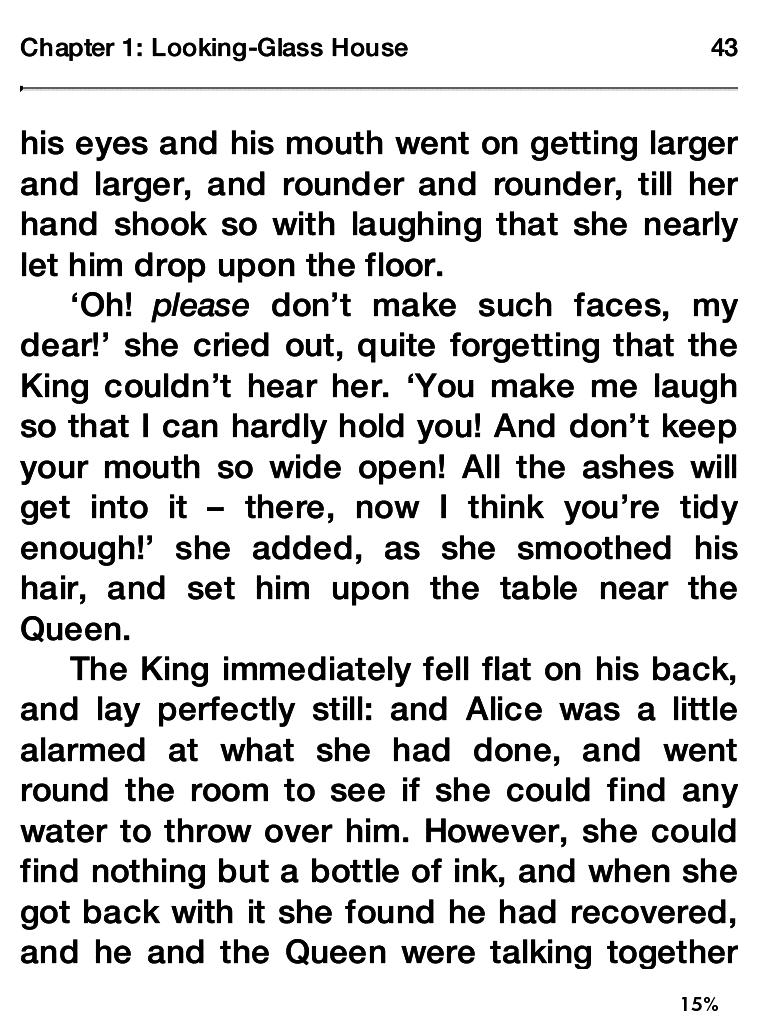 src/calibre/ebooks/pdf/render/from_html.py Thank you for implementation this ingenious technique of adding personal hacks Just one suggestion while we are on the same page: It'd be nice to have title truncated to fit into the page width. Longer title like Through the Looking-Glass, and What Alice Found There entirely carry over to the next line so that even existing 36 pt limit might be not able to accommodate it. Last edited by EbokJunkie; 01-06-2015 at 08:20 PM. |