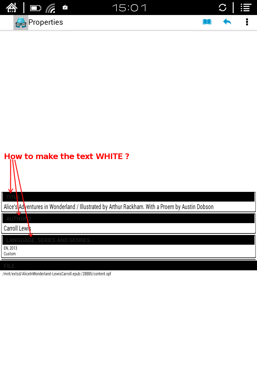 I have successfully decompiled framework-res.apk and SystemUI.apk from my Onyx M96. I want to change (tweak) some system's colors: 1. for text in the "options screen" (see Pic1.png) 2. for text in the "info screen" (see Pic2.png) 3. for icons (see Pic3.png) Developer of the Alreader app wrote me that these colors are specific for actual version of android and especially for E-ink isn't posible to change/override them from ereader application. Unfornatelly, the system "res" files are too big for me to search right items and also I'm new in android. Does exist any GUI editor for tweaking SystemUI where I can easily change any text/icon colors? Thanks for help |