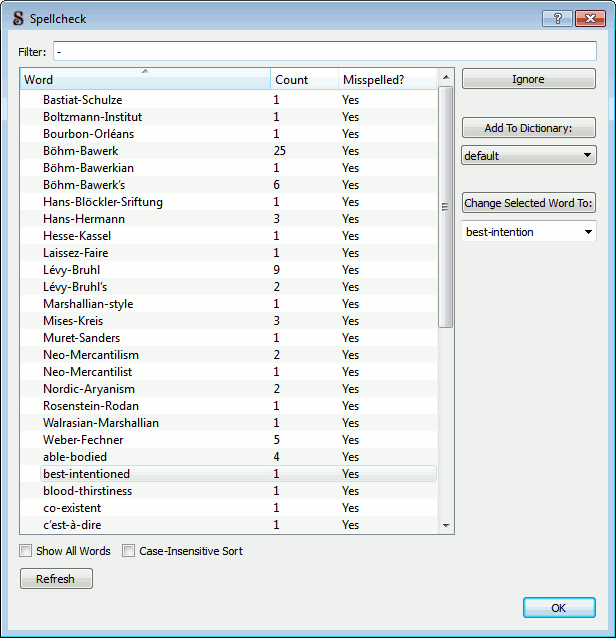 In the "Filter" box, I just stick a hyphen. This will show you every single word with a hyphen in it. Then you can quickly scan the list and see if you spot any oddities. For example, things like "-the" or "-and" will almost NEVER be correct. So when you have a sentence like this: