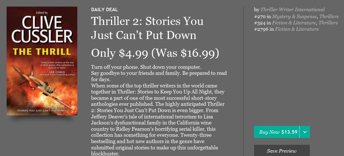 Deal of the Day: Clive Cussler - now $4.00 Was: $16.99 Buy now: $13.59 front page kobobooks.com (Aus) |