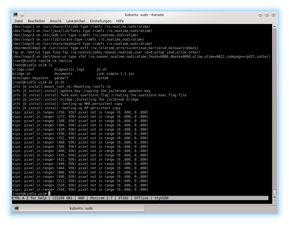 I have root-access and I executed jb.sh successfully (according to the terminal) but - NOTHING CHANGED ![]() after rebooting I get no 'jailbreak' - logo and I am not able to install KUAL(v2.5) and MRPI ... the command 'mountpoint' is not supported here is cat /proc/partitions Code: