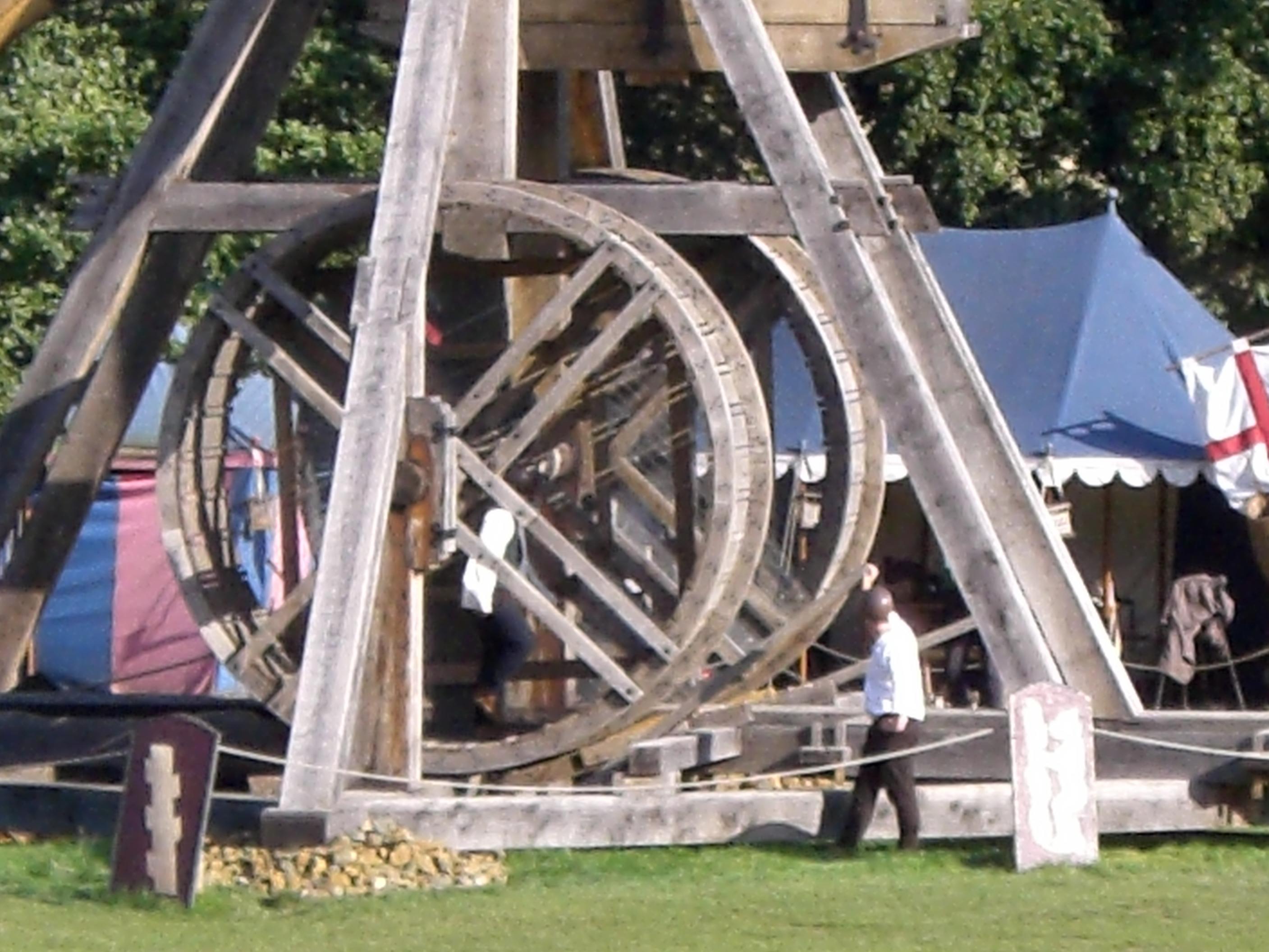 Oh, sorry -- I forgot. This was at Warwick Castle, UK. Sept 2006. The blurry shot shows the man running the hamster-wheel to wind the thing up (down). The guy standing alone was the announcer, to tell the crowd what was occurring.