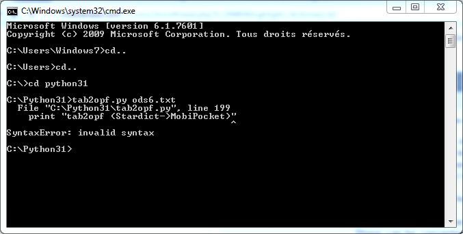 C:\Python31>tab2opf.py ods6.txt File "C:\Python31\tab2opf.py", line 199 print "tab2opf (Stardict->MobiPocket)" ^ SyntaxError: invalid syntax C:\Python31>_ I do make a mistake somewhere. Even the comand line instructions are easy to execute, I'm sure I miss something important