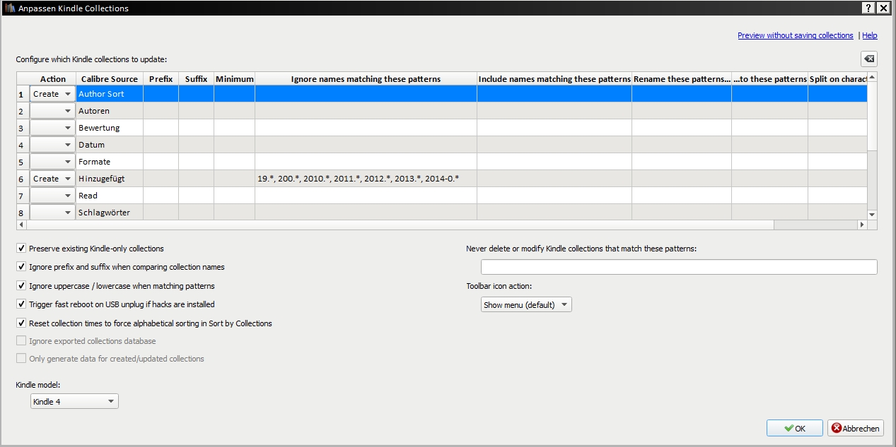I've been updating my calibre library for my kindle 4 and created some new collections. I primarly create collection for authors (1 in screenshot). I've also created collections for books I added for the last months (6 in screenshot). I've added a custom colum for this, as I couldn't figure it out anyway else.