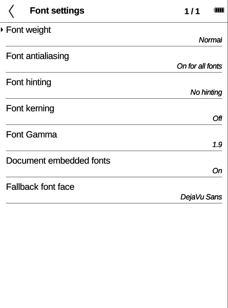 Suppose you have 3 pages of fonts and the last page contains 4 items; when you select on of the fonts on the last page you can't select another font on page 1 or 2 beyond the first four fonts at either page. When you exit Cool Reader solves the issue: afterwards you can select all fonts again...