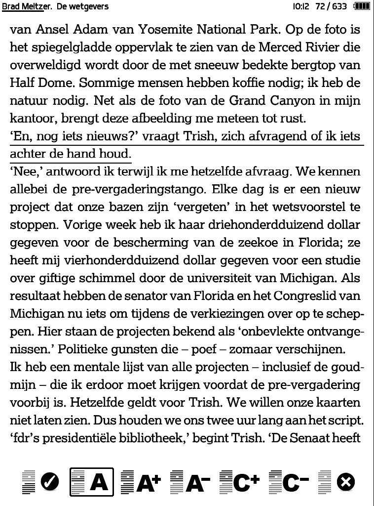 When you call a menu setting and set a value on the last page, you afterwards can't set a value on an earlier page further than items available on the last page of this menu item. Confusing? You won't be after the next episode of Soap ![]() Suppose you have 3 pages of fonts and the last page contains 4 items; when you select on of the fonts on the last page you can't select another font on page 1 or 2 beyond the first four fonts at either page. When you exit Cool Reader solves the issue: afterwards you can select all fonts again... |