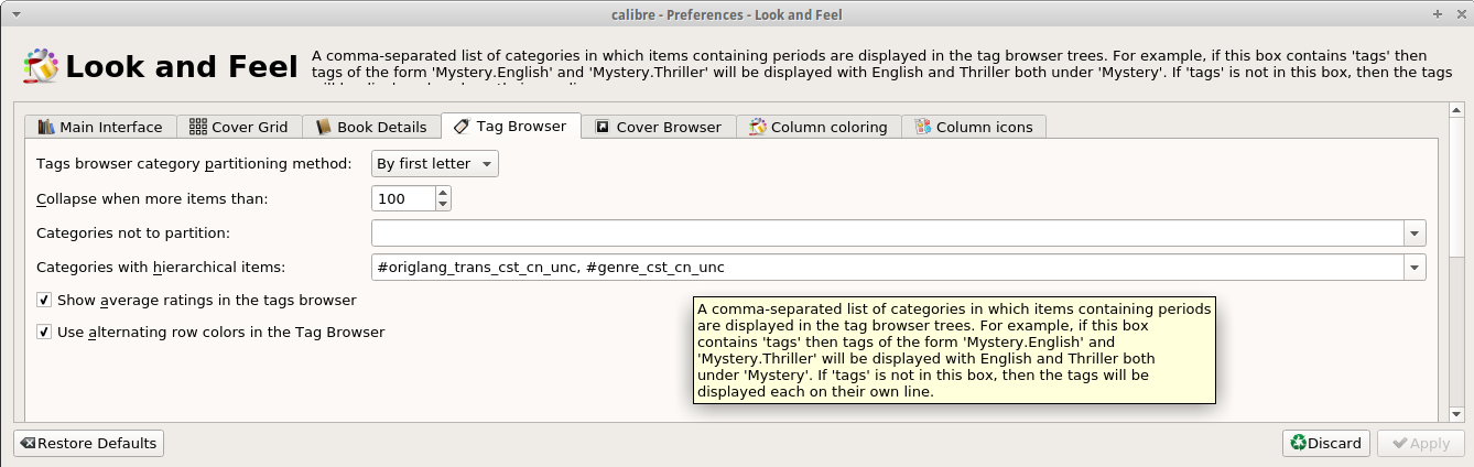 A little query about the pop-up infos in the Preferences -> Interface -> Look and Feel -> Tag Browser window. Depending on the position of the pointer information is presented in different ways. Info in pop-up box. Info in pop-up box and above. So far that's all right even for me that's a gimmick. But in case of a long info text it doesn't work properly. Info in pop-up box and above only partly (15 inch screen, full screen height wouldn't change anything). IMHO the pop-up infos would be totally sufficient. The view time of these pop-up infos I have found they are relative to the length of the info text. E.g. the pop-up info to Categories with hierarchical items (longest one) lasts 20 sec, that to Show average ratings in the tag browser (shortest one) is 10 sec. (The others are between in time.) Show average ratings in the tag browser Sophisticated! But a non-English speaking person sometimes needs longer to comprehend the info. Moving the mouse pointer drops them anyway. Where is to set the duration? Last edited by chaot; 04-10-2015 at 08:47 AM. Reason: Ile (Improvement of linguistic expression): But a non-English speaking person sometimes needs ... / rearrangement of images & corresponding text / trifles |