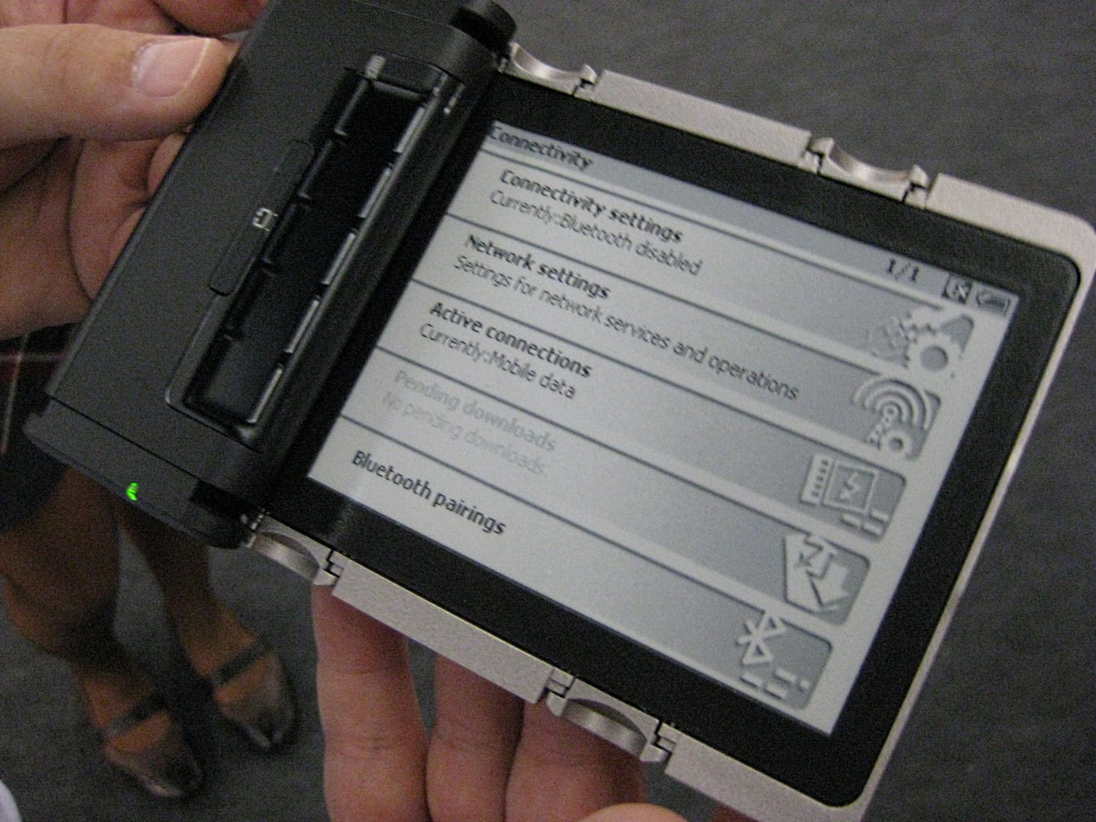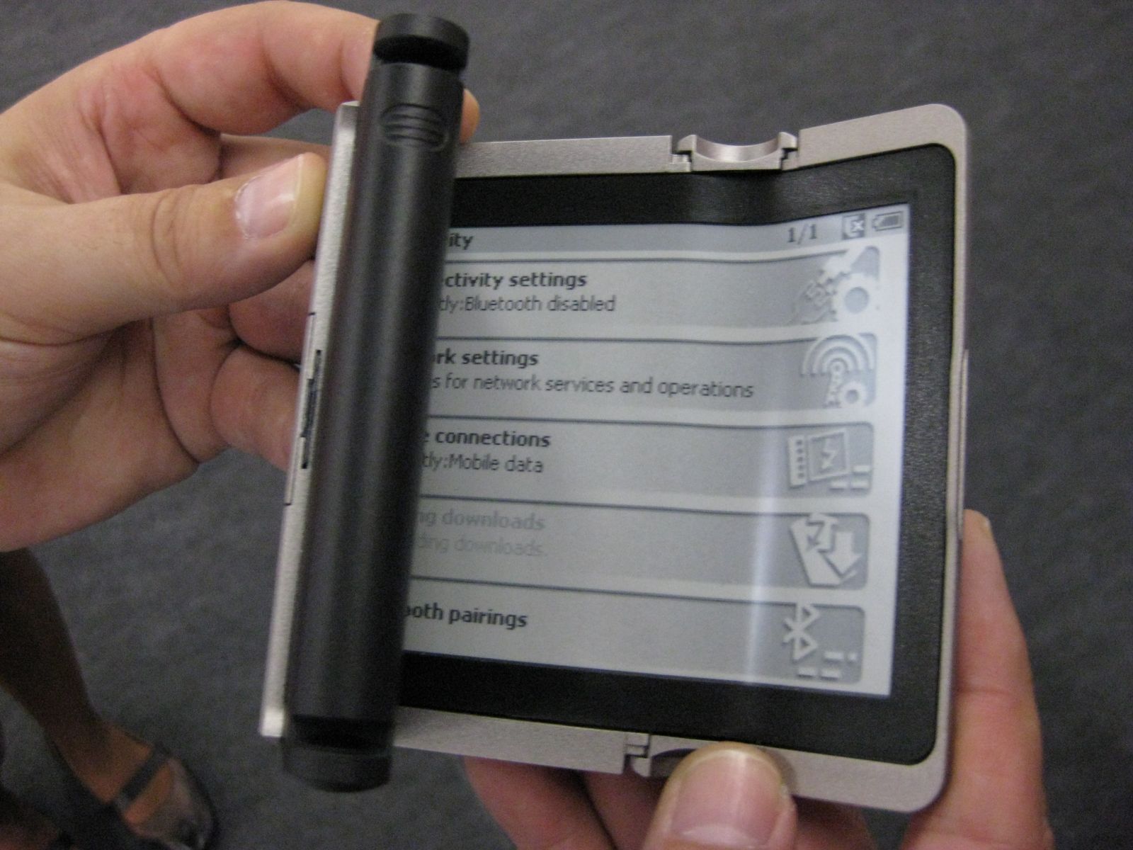 I completely forgot to upload these, but I have a couple of photos I made of the Readius during the Frankfurter Buchmesse exhibit last October. I had a chat with Polymer Vision CTO Dr. Edzer Huitema, who is the kind of guy you'd like to have a beer with. Between gulps, he will impart the details of how flexible e-paper really works. And if you order another, he'll give you a hint or two of what we can expect from his company in near future. At the time of the meeting, PV was still working on some finishing touches on the Readius, in particular in regard to the software and UI design. From what I've seen, the newspaper display looks quite compelling; it allows you to see the newspaper in layout mode and then, if you wish, to zoom into the articles. The articles are presented in reflowable text mode. Well, it's wasn't perfect yet, as you can see in one of the photos, the software appeared to have some issues with displaying unicode characters. What really does work well is the folding of the display. I admit I was nervous the first time Edzer handed me the device and asked me to open and close it. It takes some adjusting to fold a display if you are like me used to handle your precious e-book reader with utmost care. ![]() PS: The last photo is not really related.