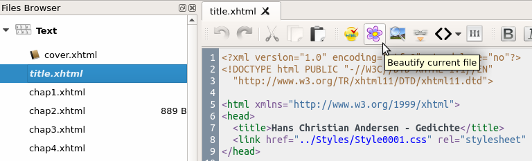 At the beginning of editing a book I see 2 or 3 routine tasks: Run Checkbook (-> No problems found) Fix HTML and/or Beautify current file The latter includes the second at least as regards the 'brown block at the beginning' of each file. Quote: