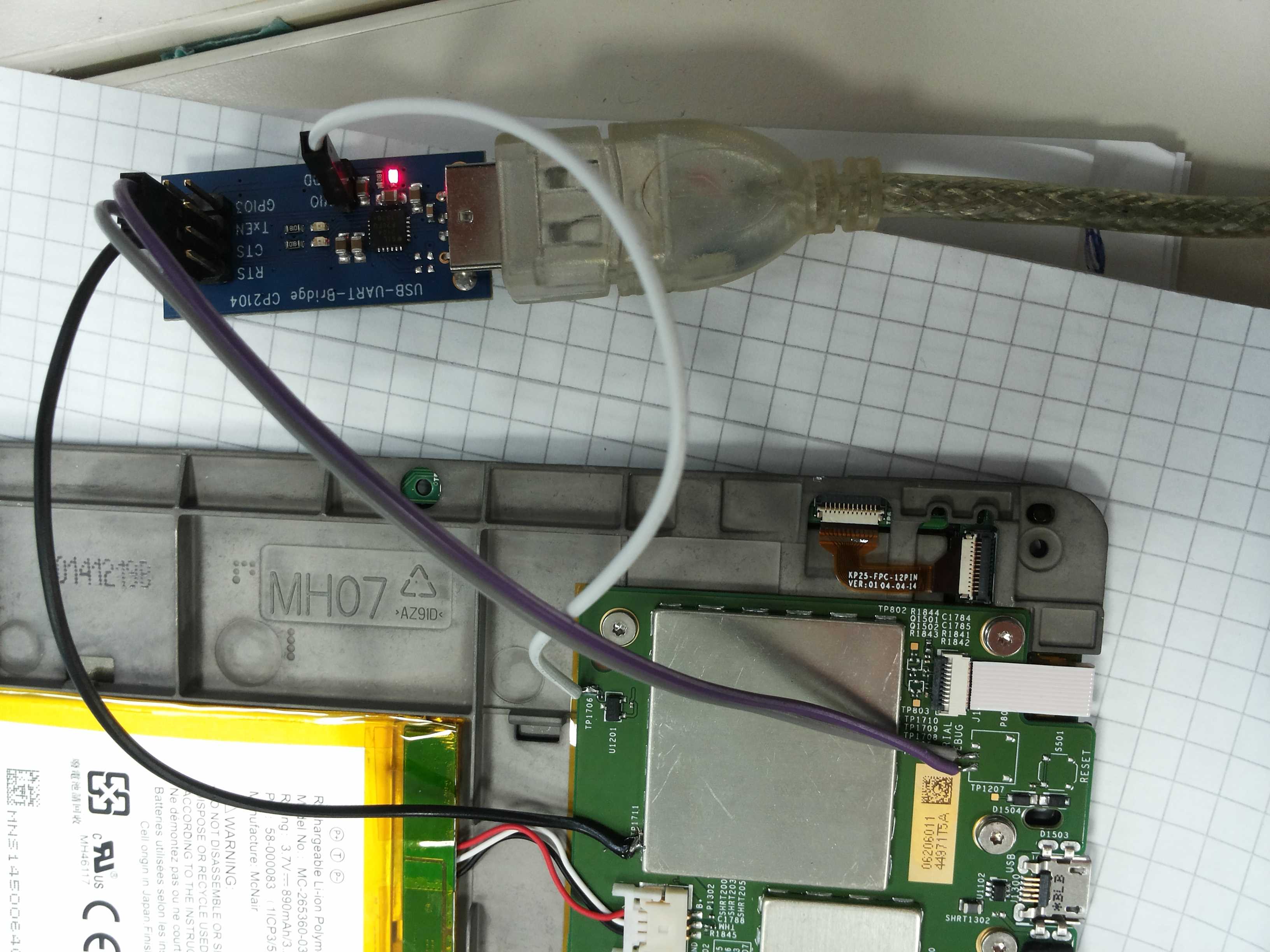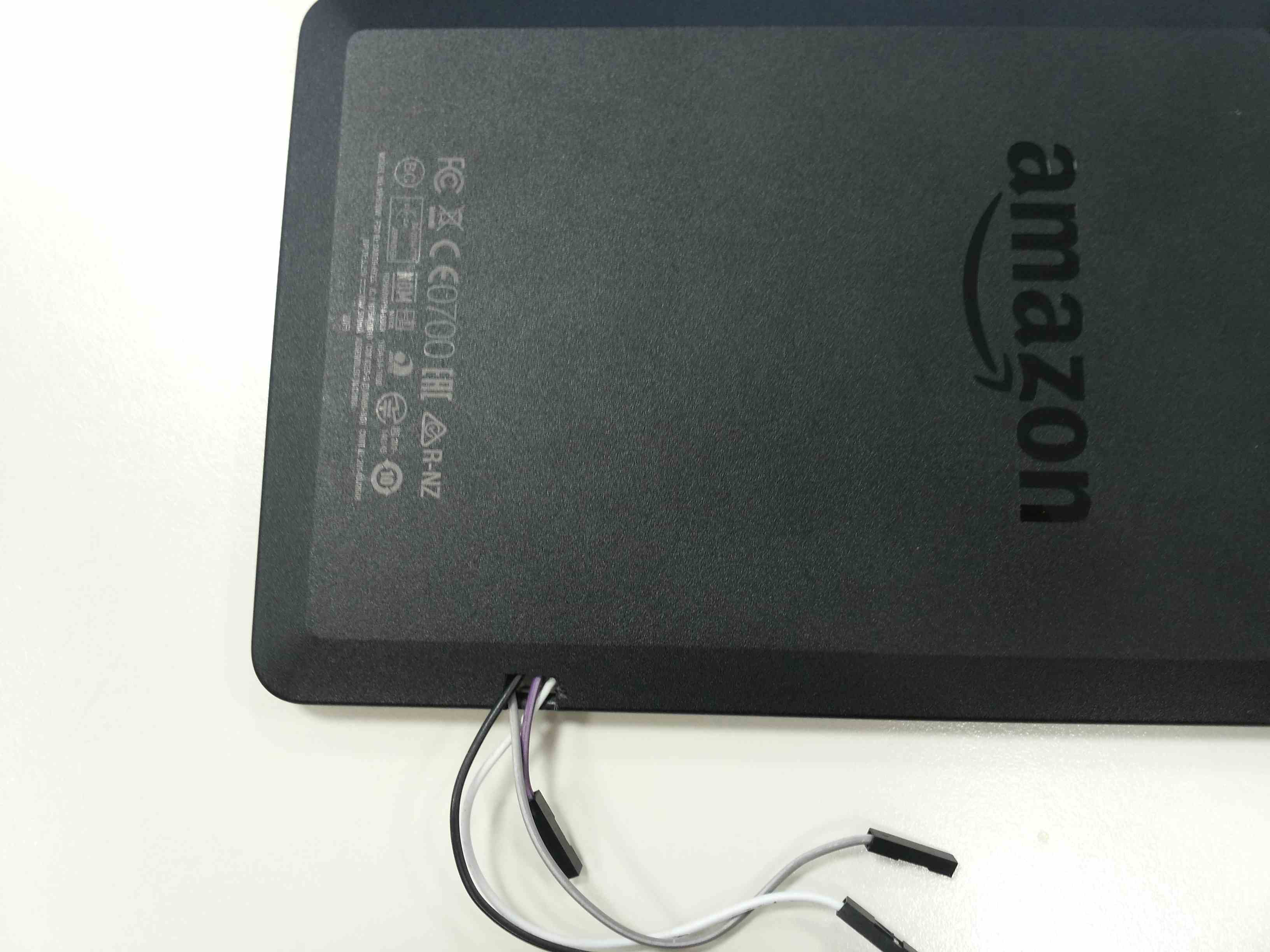 Therefor I placed the missing 2,54 cm pinstripes and used jumperwires for the connections. Normaly I playing around with microprocessors and arduinoboards, so I have plenty leying around... I made the hack on a KindleTouch2 it has the same FW (5.6.1.) like a PW2 but a little different hardware, so Im afraid you have to get other solderpoints on the device. and I took the lvl of the kindle, like knc1 told in his KT2 Exposed Thread On the picture: white cable = VIO (1,8V) black cable = GND (getting same potentials) purple cable = Tx gray cable = Rx Last edited by volkaoth; 01-23-2015 at 03:27 AM. Reason: answering for a PW2 owner |